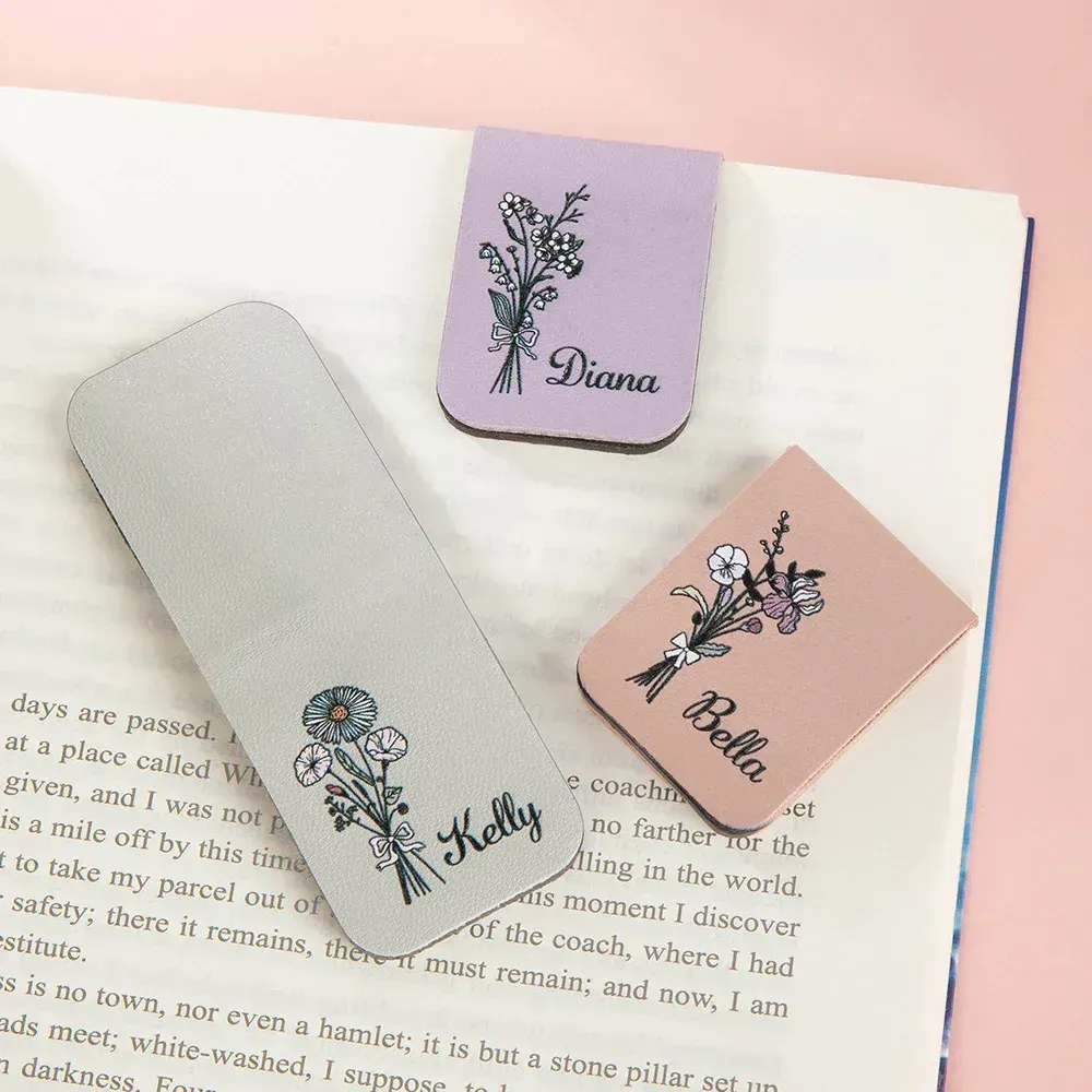 Tu flor personal, tu amuleto de lectura: clip magnético personalizado con tu nombre para marcar páginas.